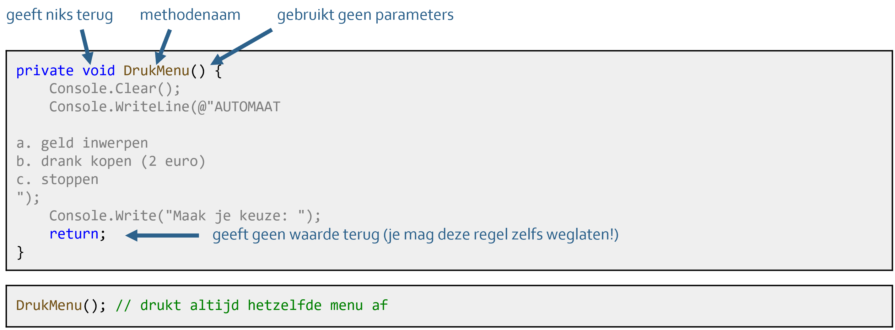 Dit zijn eerder domme methodes, die altijd hetzelfde "doen". Voorbeeld van een methode die een keuzemenu afdrukt: