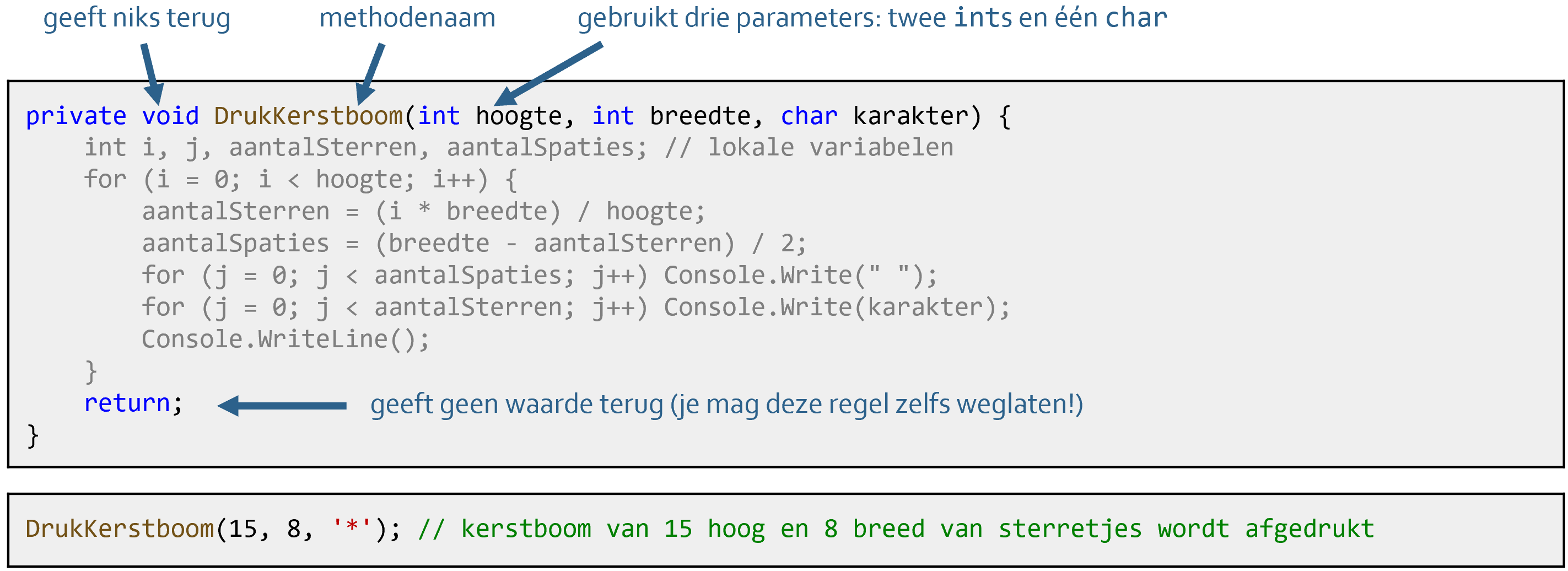 Deze methodes lijken op de vorige, behalve dat wat ze doen afhankelijk is van parameters, ze "realiseren". Voorbeeld van een methode die een kerstboom afdrukt: