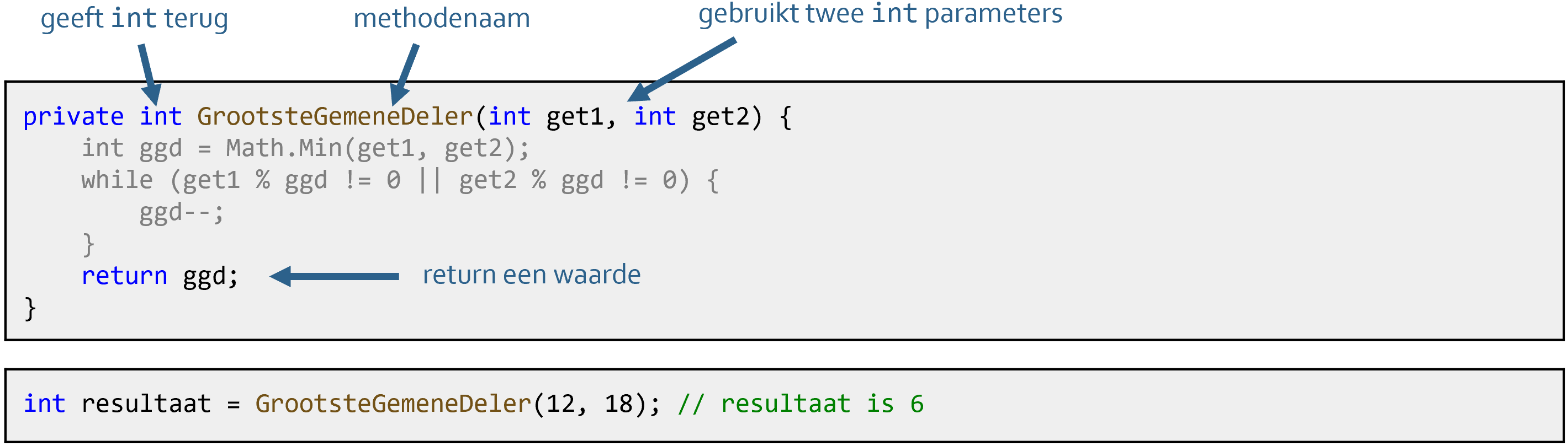 Dergelijke methodes accepteren input, en geven een resultaat terug: ze "genereren". Methode die twee gehele getallen vraagt, en de grootste gemene deler teruggeeft: