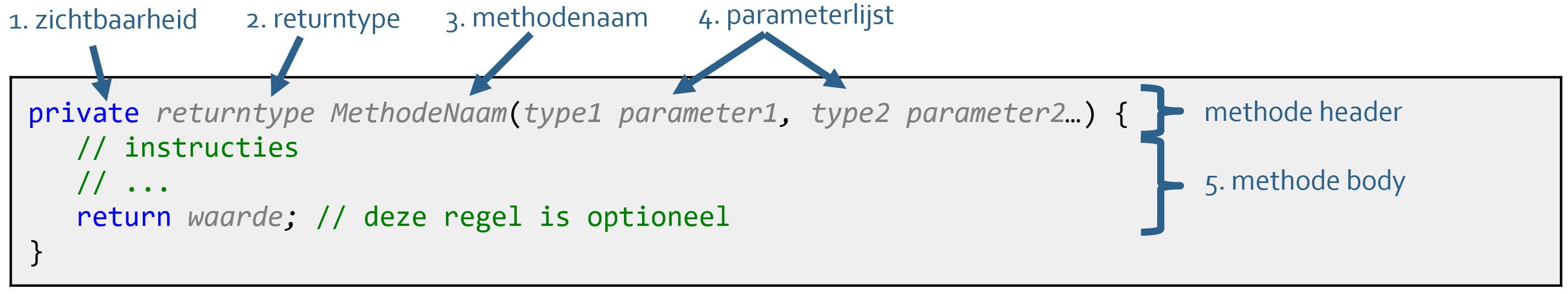 private returntype MethodeNaam(type1 parameter1, type2 parameter2…)