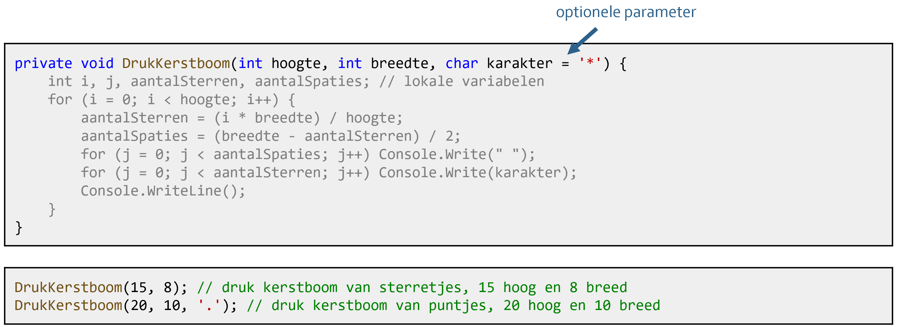 Een tweede iets uitgebreider voorbeeld met achteraan drie optionele parameters (merk op: optionele parameters moeten achteraan de parameterlijst staan):