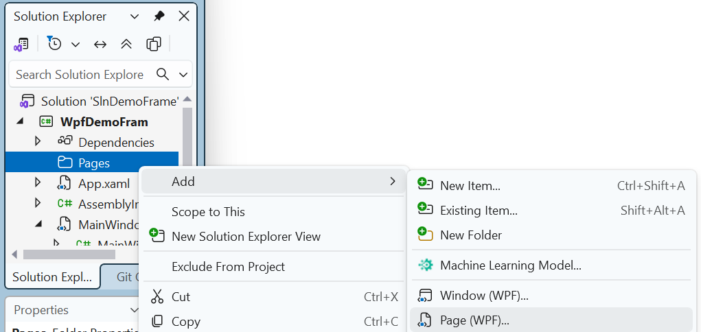 Voeg elke pagina toe via Add, Page (WPF)..., bijvoorbeeld in een nieuwe submap Pages: