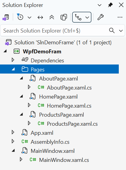 Page heeft een eigen .xaml en code-behindOm de code georganiseerd te houden, gebruik je best een submap Pages en geef je elke Page de suffix “Page”, dus b.v. HomePage, ProductsPage en AboutPage.