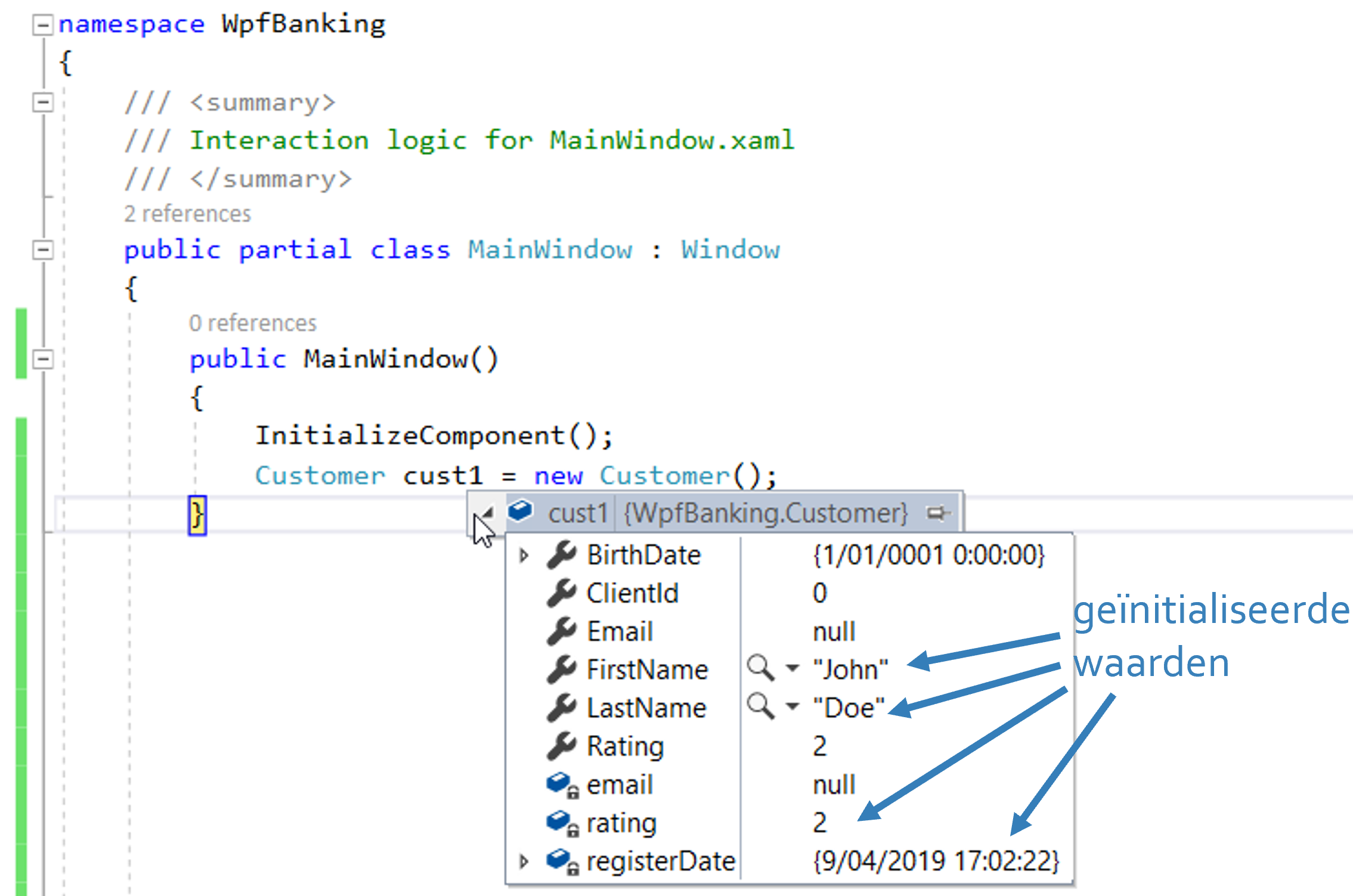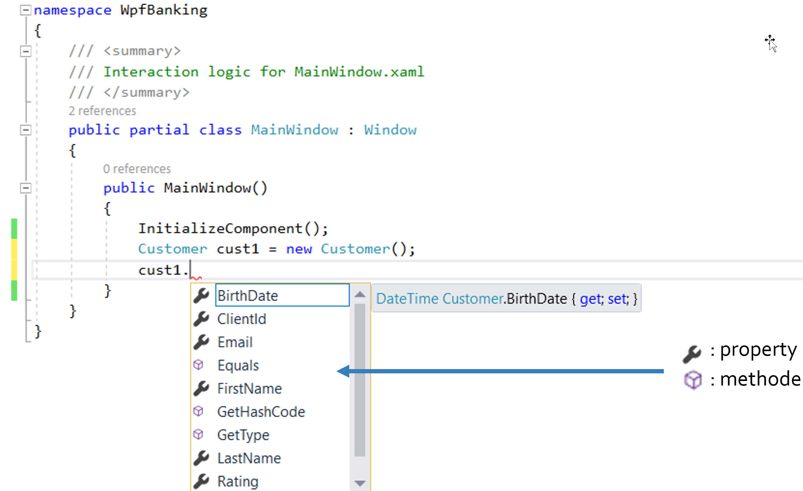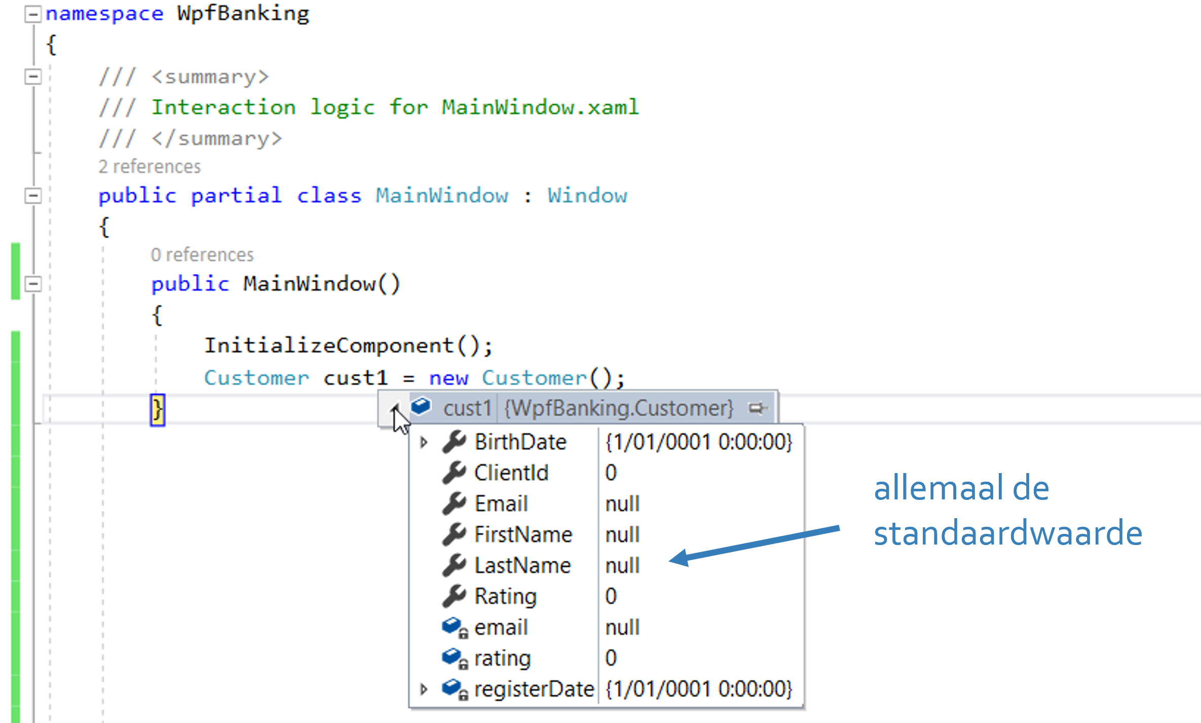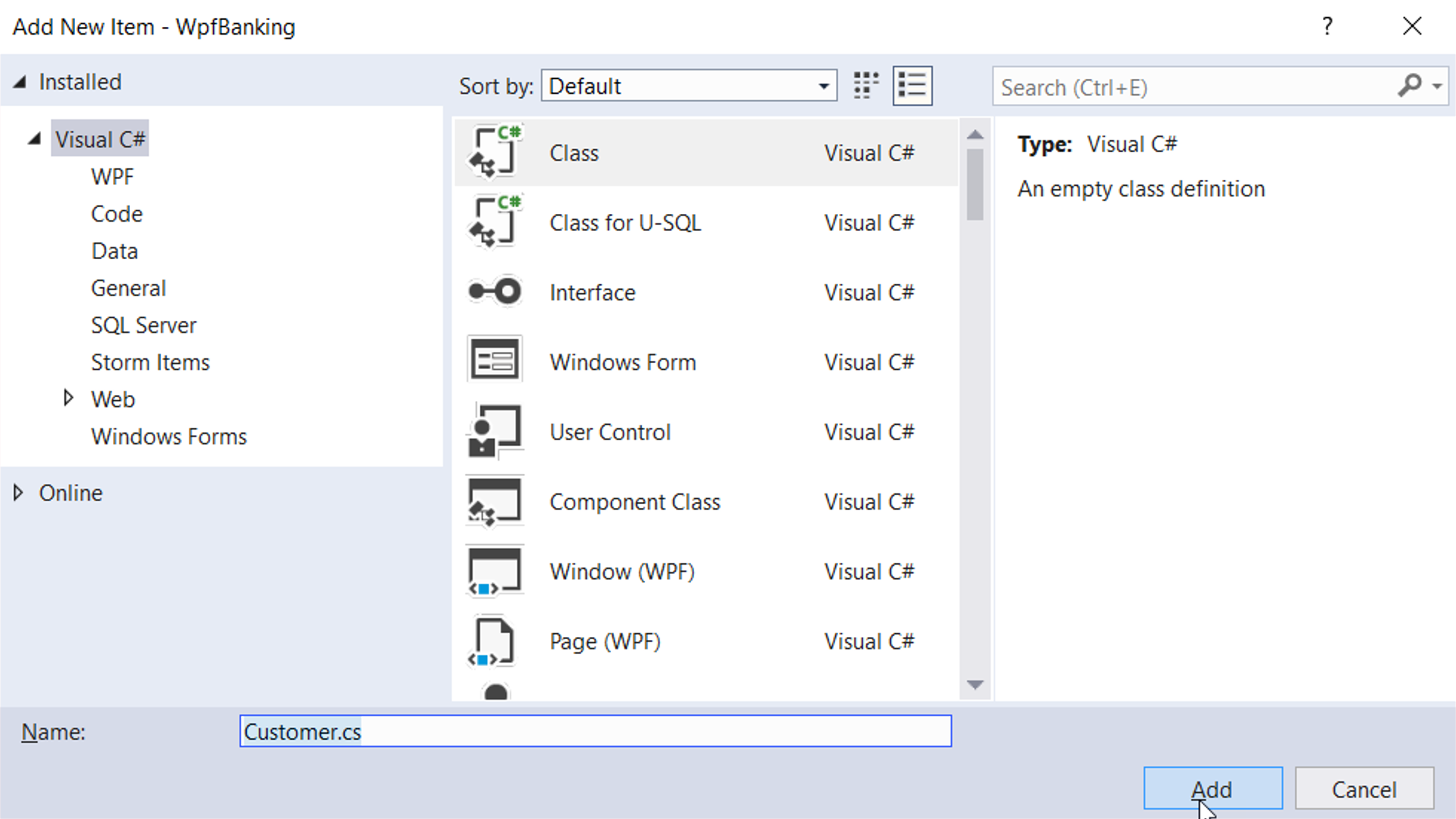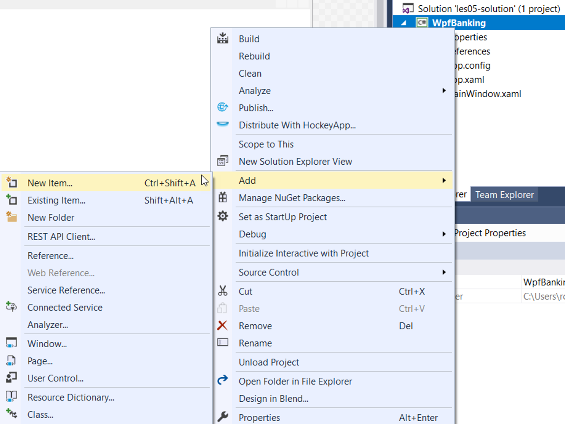 Een class is een sjabloon (template) voor het aanmaken van nieuwe objecten. Stel dat we aan een project WpfBanking bezig zijn (met Console apps kan het ook); een nieuwe class voeg je toe via Add, New Item…