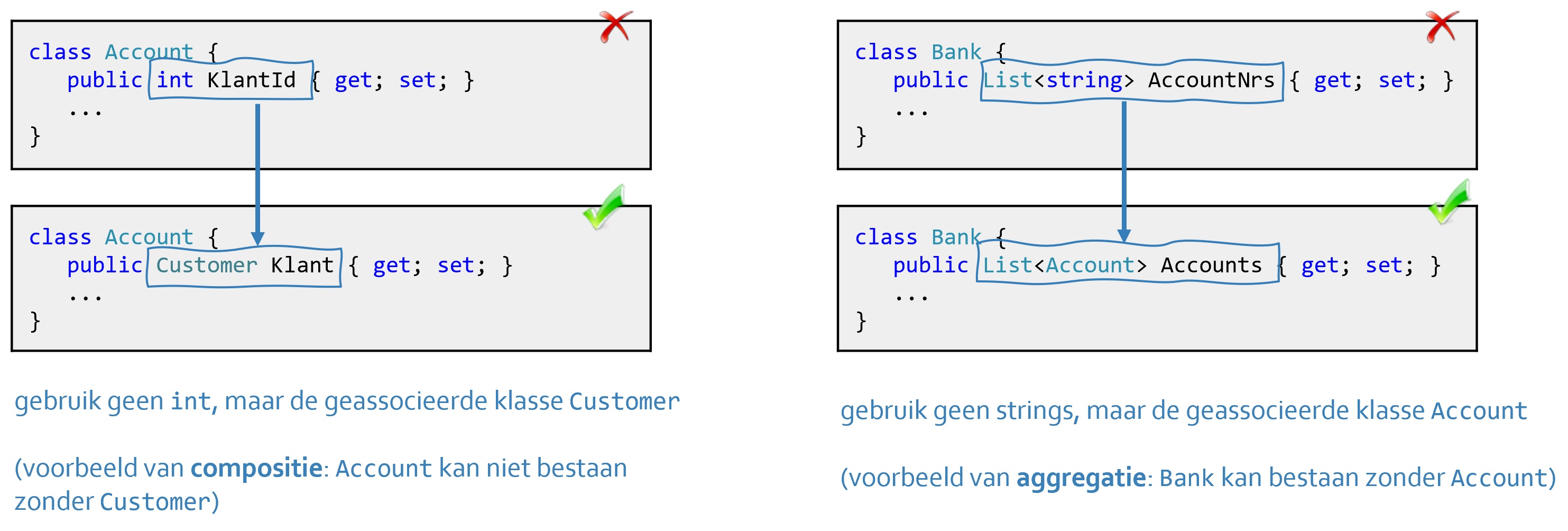 Als klassen met elkaar gerelateerd zijn ("associatie"), gebruik ze dan ook in elkaars definitie. Er zijn twee soorten: de compositie (A kan niet bestaan zonder B) en de aggregatie (A kan wel bestaan zonder B).