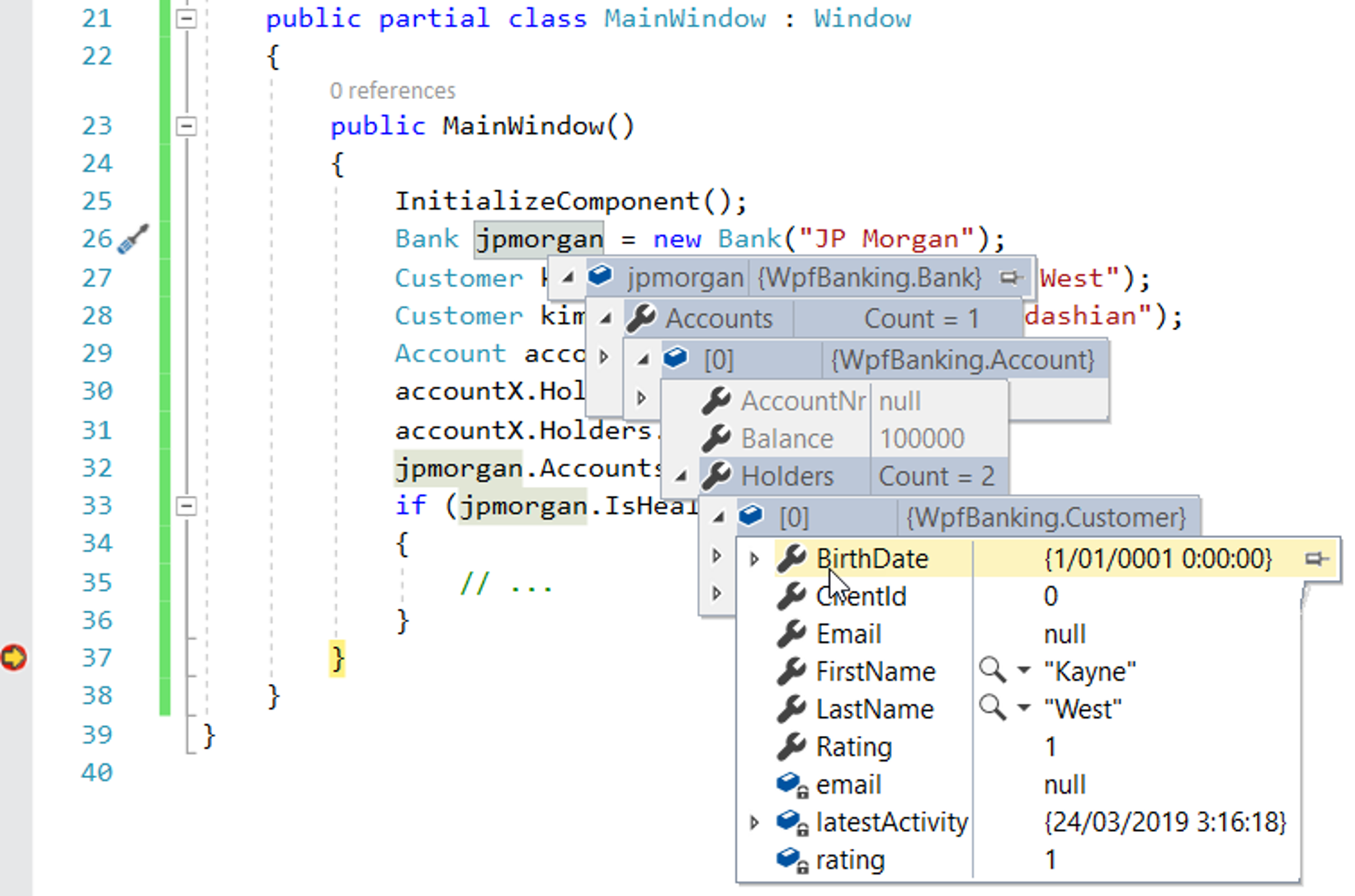 In debugger mode kun je doorklikken in de objectstructuur, bv. Bank → Accounts → Customers →...