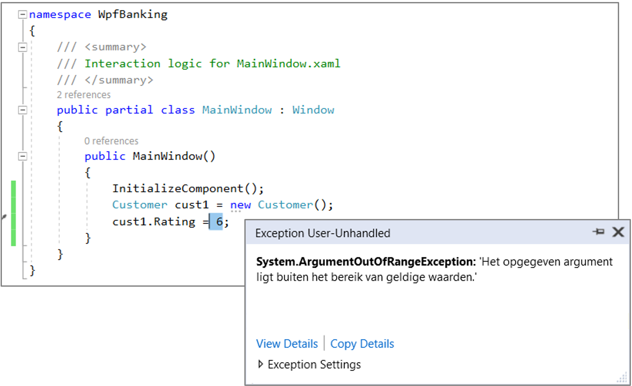 throw new ArgumentOutOfRangeException($"rating moet tussen 1 en 5 liggen");