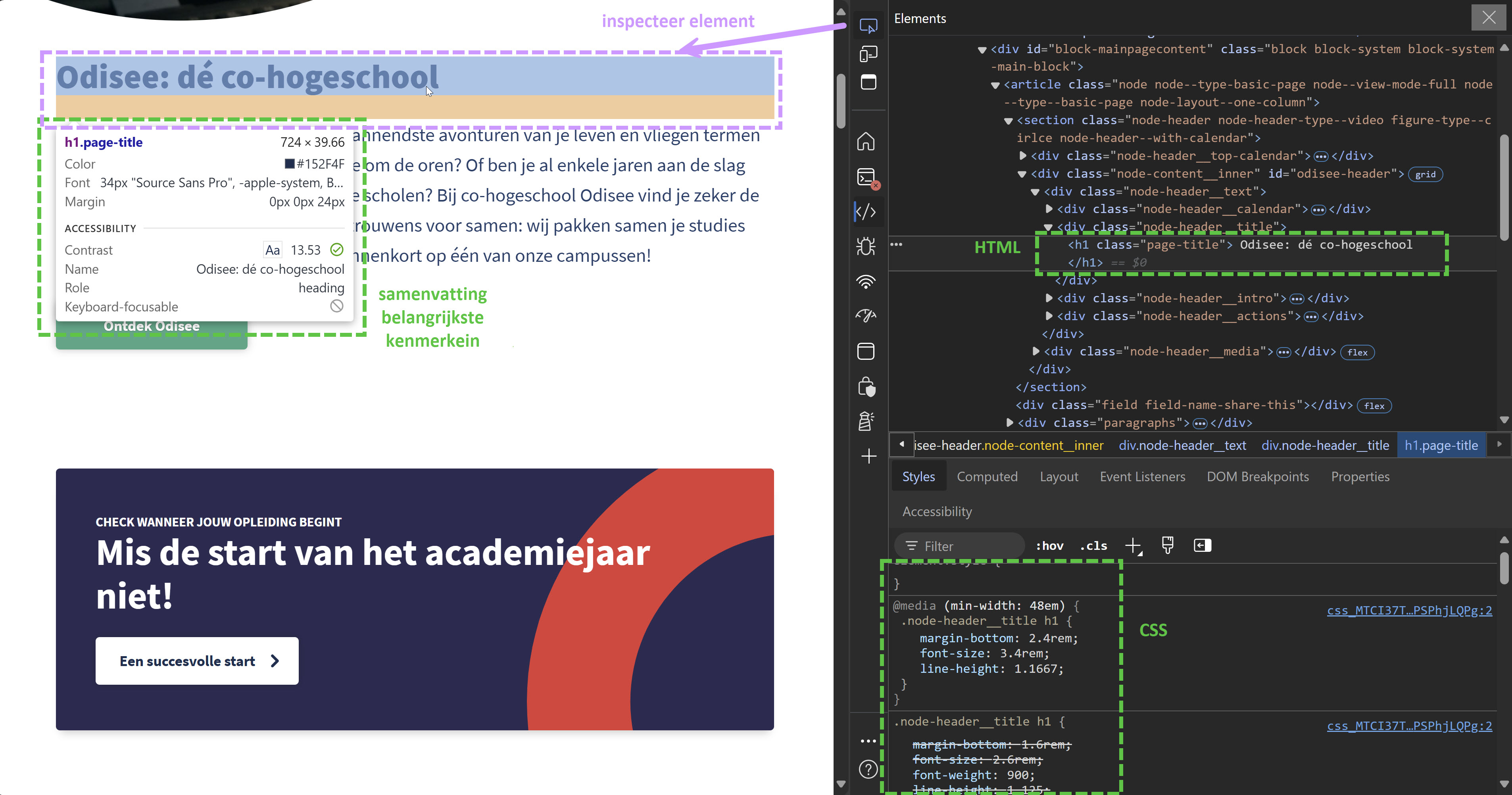 De verschillende onderdelen van de pagina kan je inspecteren met de inspector.